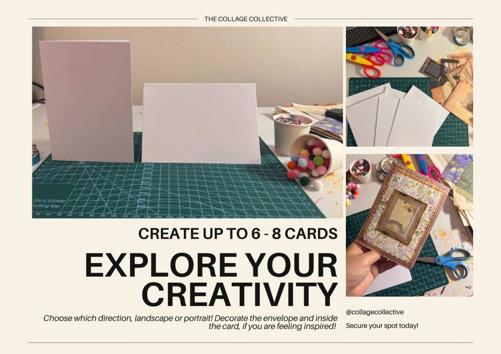 ✂️ Explore & Create: You’ll dive into a curated collection of papers, vintage imagery, stamps, inks, and embellishments. With demonstrations and hands-on guidance, you’ll learn techniques for layering and composition. Additionally, you’ll explore adding mixed media details to bring your cards to life.